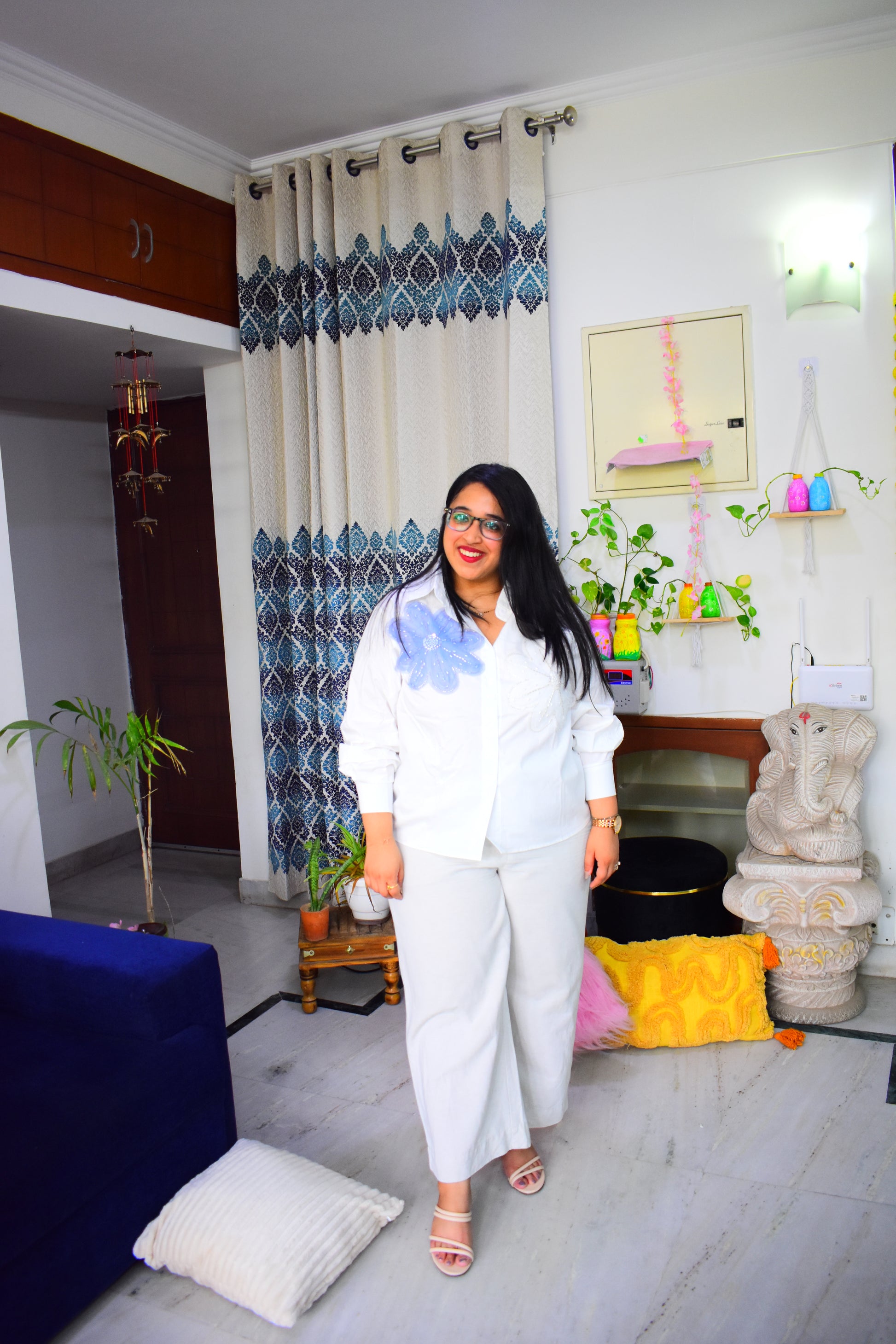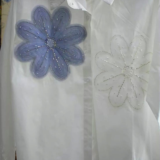 A pretty white loose fit Shirt, with a kiss of glam, the cotton shirt has stone work on the flower detailing, its Pinterest worthy shirt, Super casual and for special occasions, style it accordingly. Fits up to size 3XL, but equally perfect for L, XL, 2XL bodies to give a loose fit look.