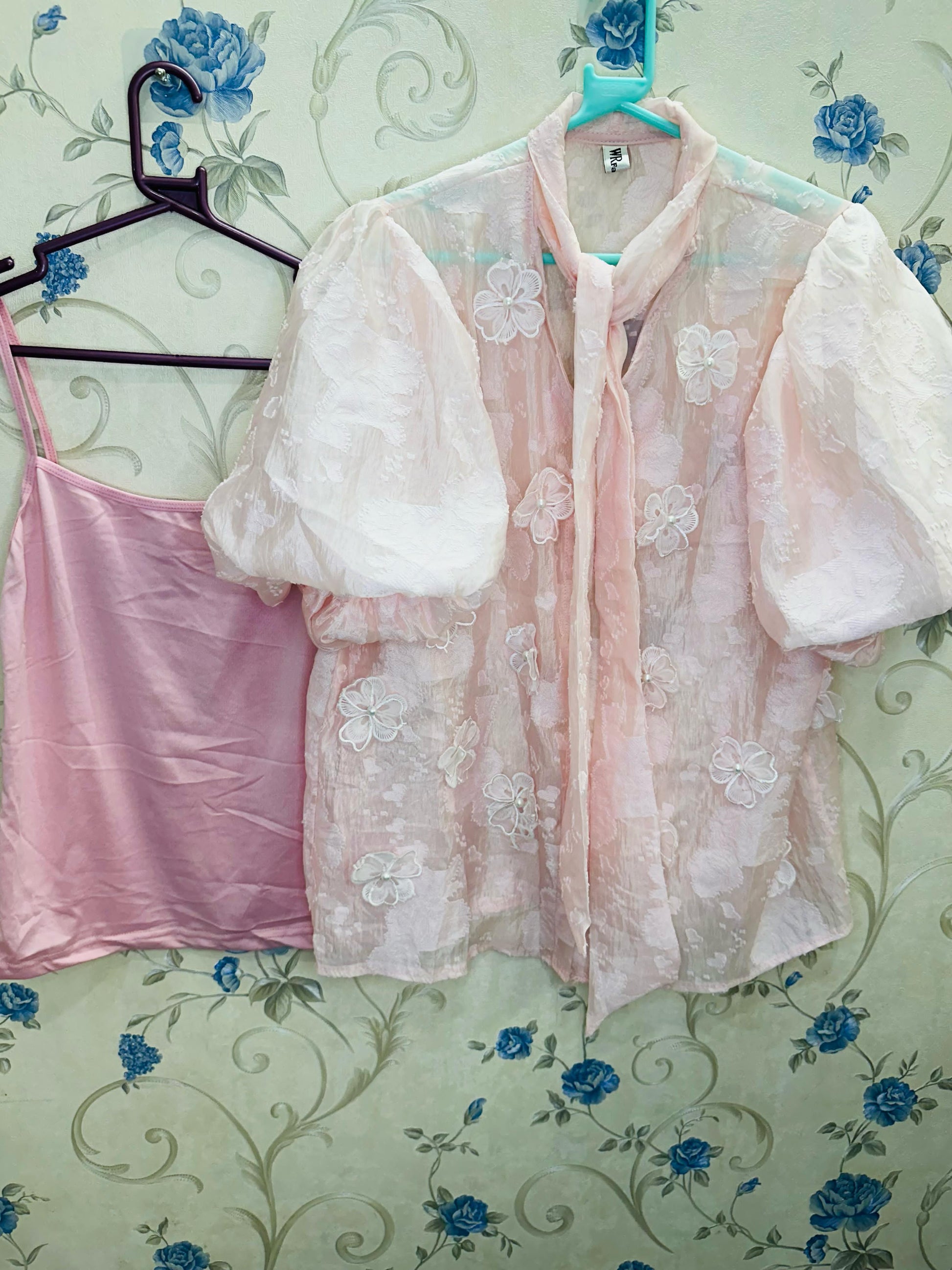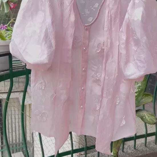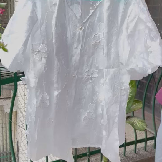 This sophisticated cute and chic poplin cotton shirt adds a touch of elegance and a vintage vibe with pearl buttons in front and a neck bow tie, The flower embroidery softens the look with a romantic touch and puff sleeves which is super on trend effortlessly combines elegance and comfort. Made from breathable and light weight poplin cotton offers a relaxed yet stylish fit. This shirt is available with inner so we don’t have to worry about layering or sheerness. It’s built for comfort and ease. Available in 2 colors white and baby pink color. Fits up to M size.