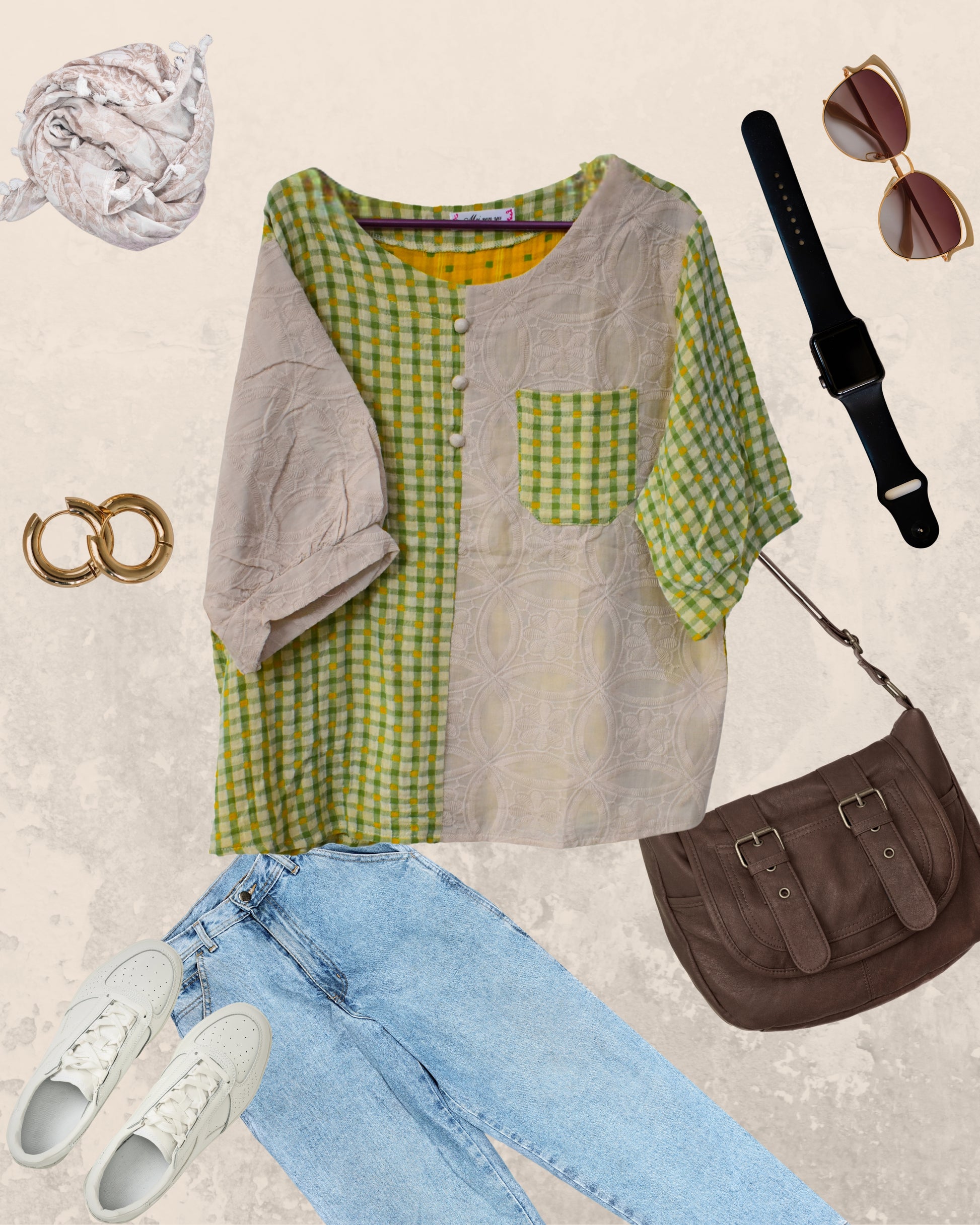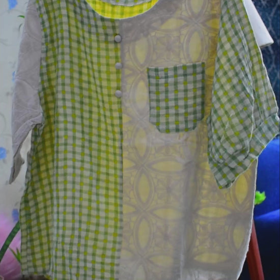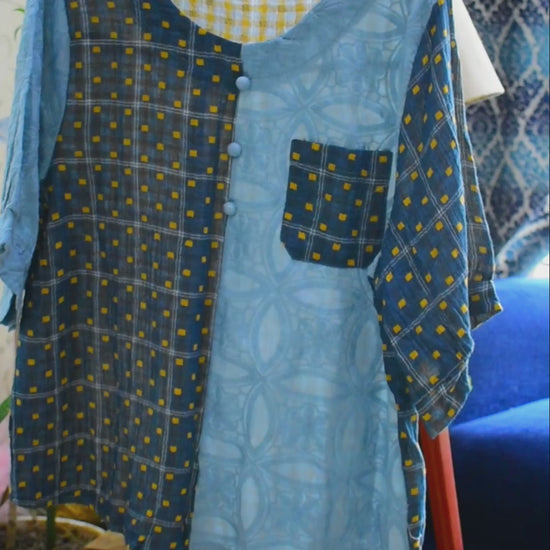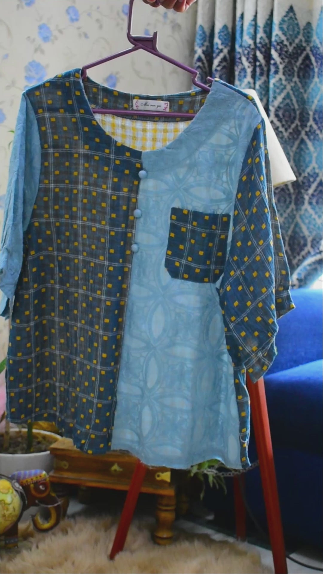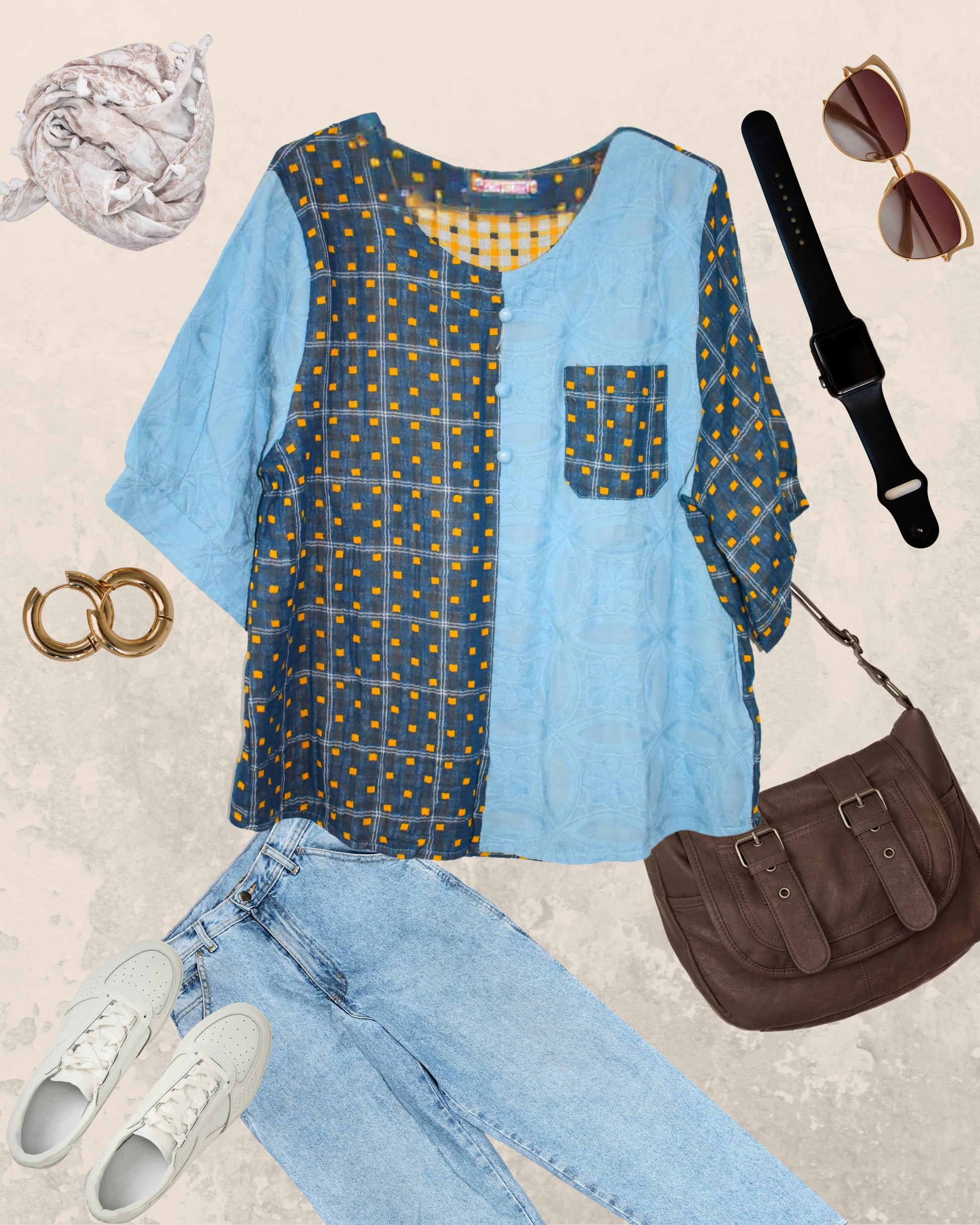A casual top with premium cotton fabric and checked look giving the storybook vibe with patch work pockets on the side. An elegant top with regal colors- Slate Blue and Beige. Size fit is 2XL, but ideal for M, L bodies as well for the loose fit look.