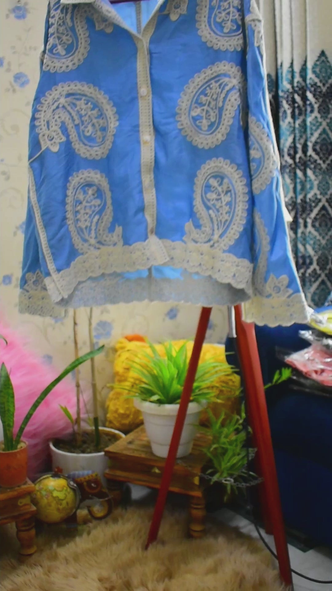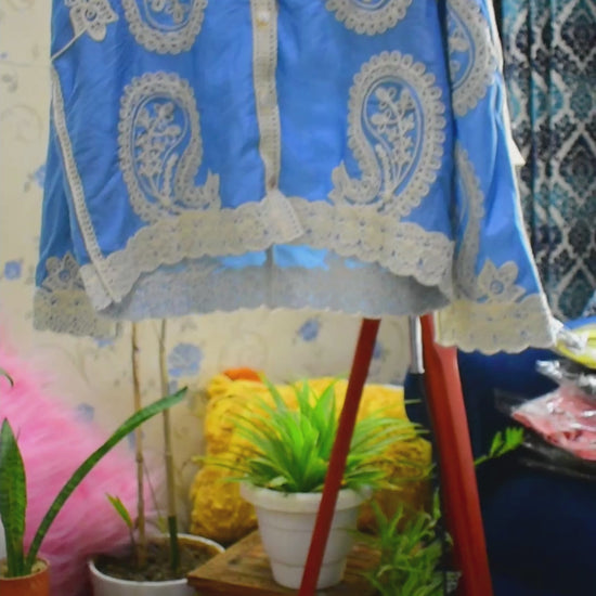 The trend, as we say, this combination has been going viral this year, and we have the prefect one for you. The fabric is glazed cotton, which is a slightly heavy cotton. Embroidery is present all over the 2 piece. A shiny blue color, perfect for the season. Size is XL. Waist: 41, Hip: 44, Thigh: 25(one-side)