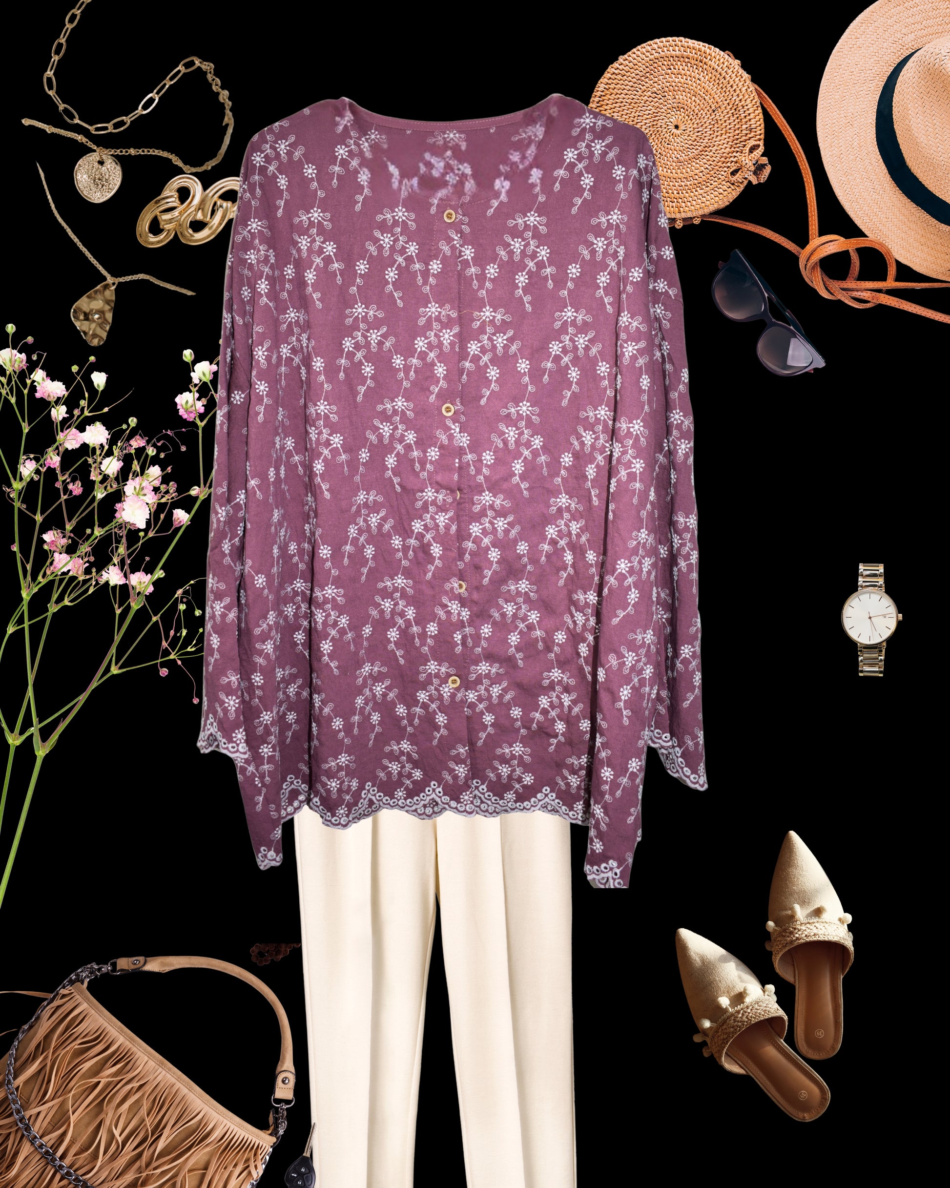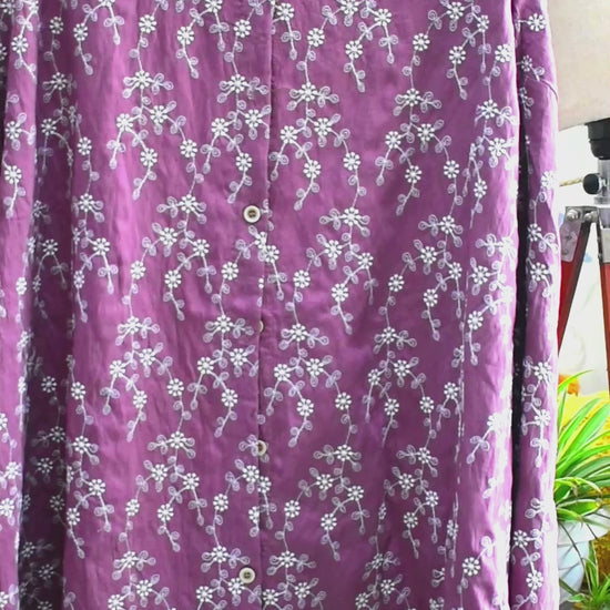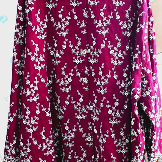 Again an embroidered masterpiece. This is a loose fit top(Free Size). This Top is all things hard work, made with extremely intricate embroidery placed all over the top, this top gives the 'IT' vibe. Has cutwork over the bottom, and on the sleeve. Buttons in the front, fabric is cotton, and a pretty silhouette. Ideal for 3XL, 4XL, 5XL bodies. Fits up to 6XL, given the loose fit. Colors are Maroon, Gold, and Mauve.