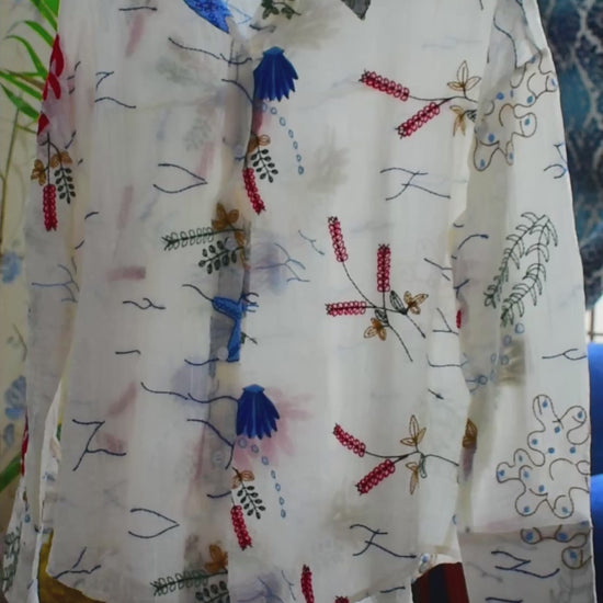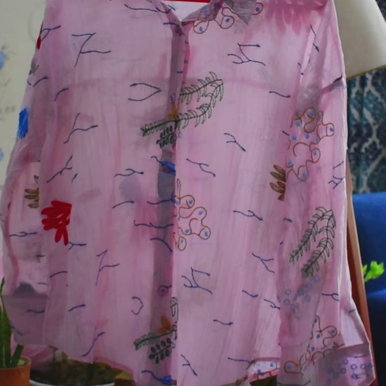 A crinkled crushed cotton loose shirt, with scribble embroidery all over the shirt. An extremely premium cotton hand embroidered on the shirt, to give a casual look. The embroidery is intricate and trendy. Comes in beautiful colors- Off-White, Mauve, and Latte. Size ideal is M, L XL, 2XL, fits up to 3XL bodies. Looks best as a loose fit.