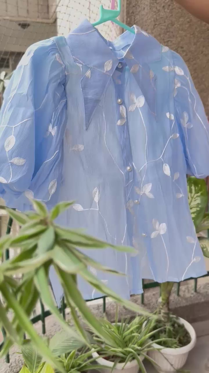 A blend of softness and statement, this Georgette Shirt is designed to stand out. Featuring delicate leaf embroidery all over, its extra voluminous puffy half sleeves add a bold, romantic silhouette that feels both airy and elevated. Crafted in lightweight georgette fabric, it drapes beautifully and comes with a comfortable inner lining for effortless wear. Whether you're heading to a brunch, a garden party, or just want to elevate your everyday look—this top is made to turn heads. Relaxed yet refined fit. Available in 2 colors dusty rose and blue color. Fits up to M size.