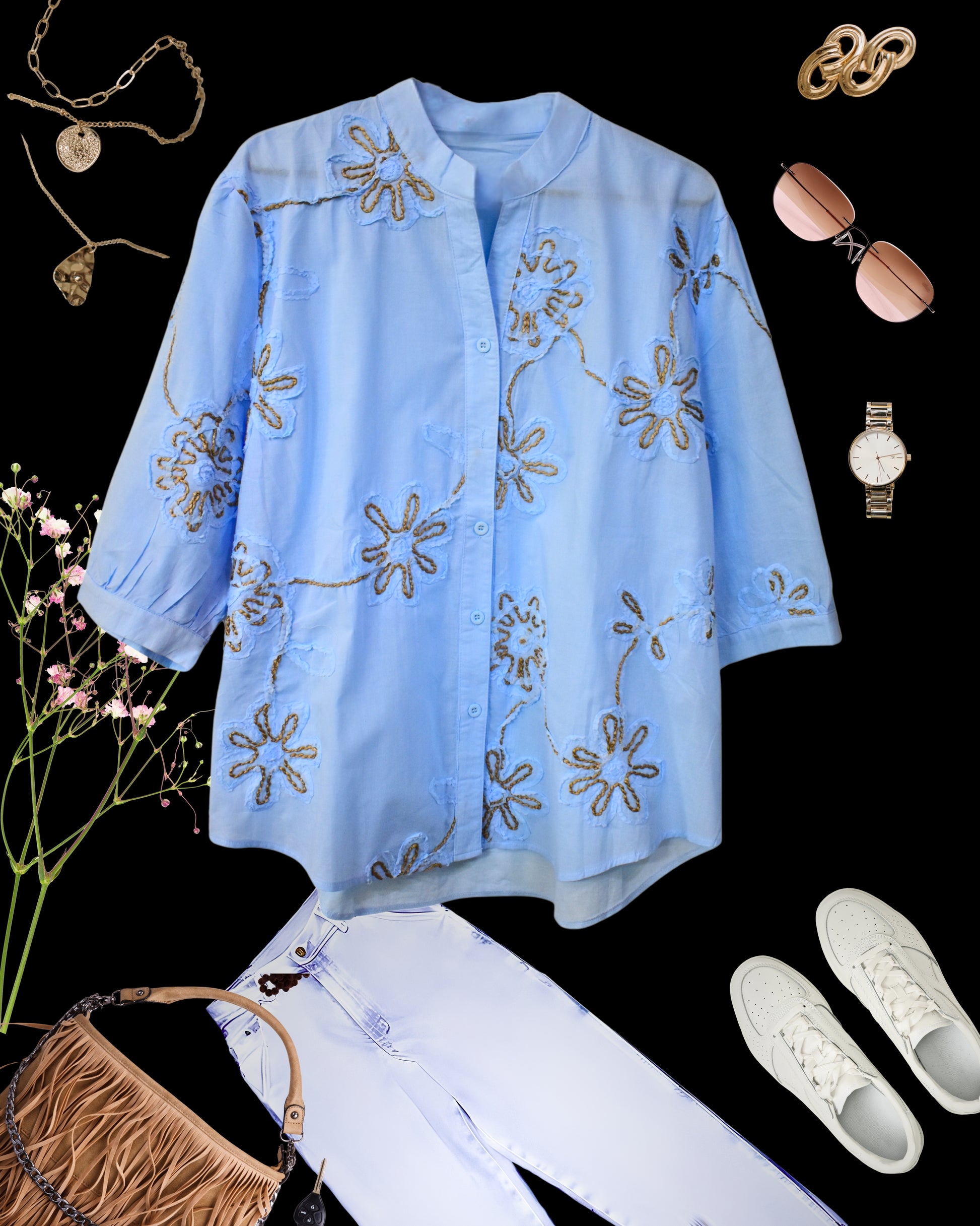 Do not iron directly on print/stones/embroidery/embellishments. Mild iron