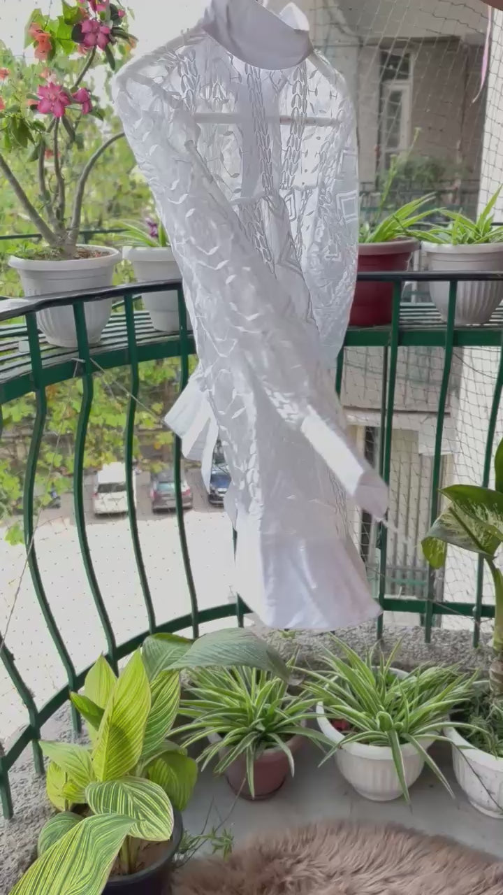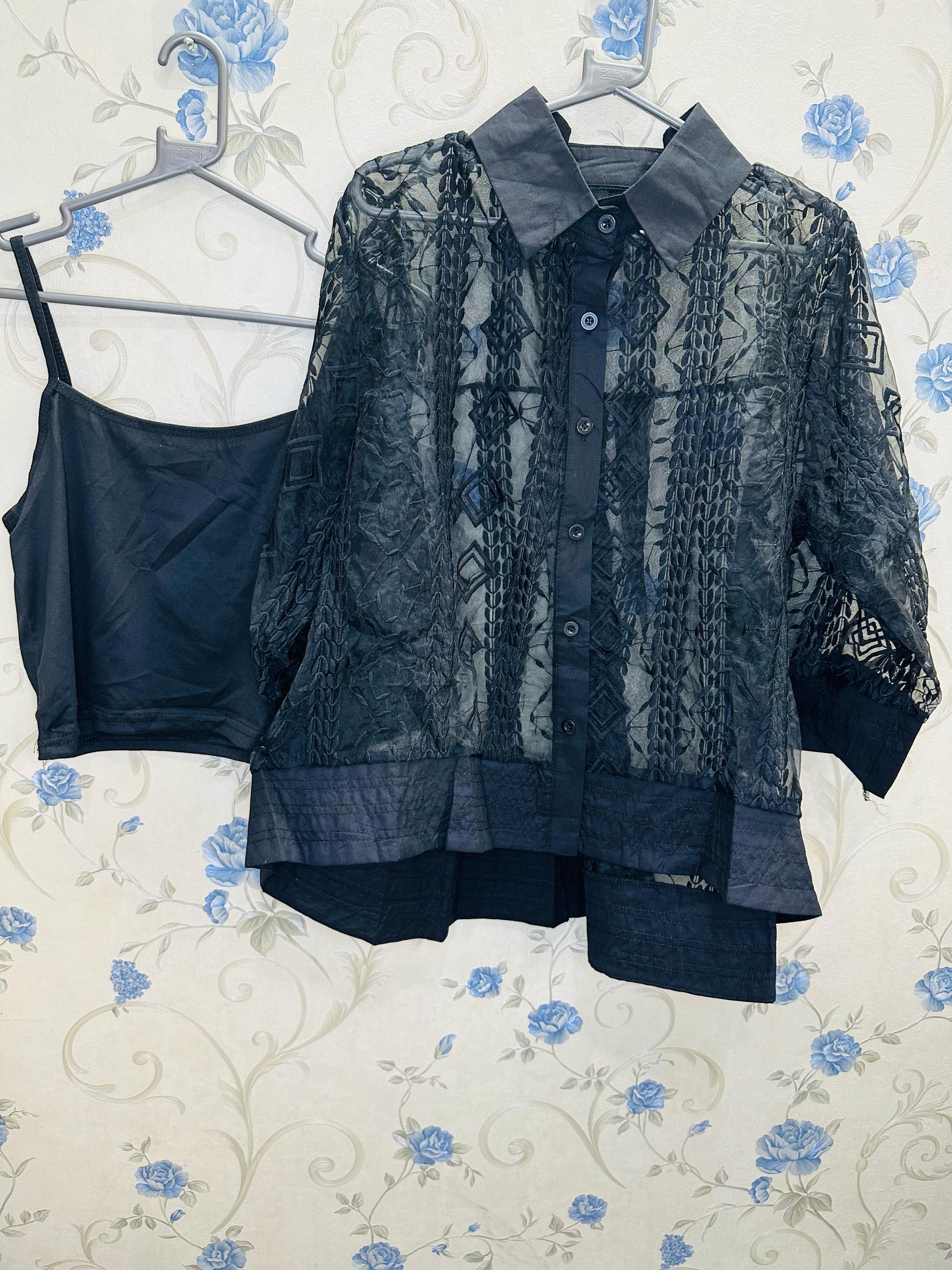 This transy Umbrella Shirt is all about soft movement and subtle detail. Crafted in sheer, flowy fabric, it features elegant vertical leaf embroidery that elongates the silhouette while adding a nature-inspired charm. The umbrella cut gives it a graceful flare, making every movement feel light and effortless. Finished with a comfortable inner, this shirt combines artistry with all-day wearability—perfect for those who love refined, statement pieces. Available in 2 colors black and white. Fits up to XL body size.